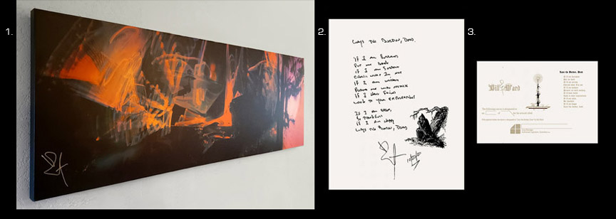 A gripping and multifaceted work, Lays the Burden, Dead is more than a massive offering of visual art crafted from Ward's drum performance. It is a unique and highly limited package that features a companion poetic offering printed on archival paper stock complete with the SceneFour chop. All canvases are numbered and individually signed by Bill Ward. Each ship with Certificates of Authenticity.